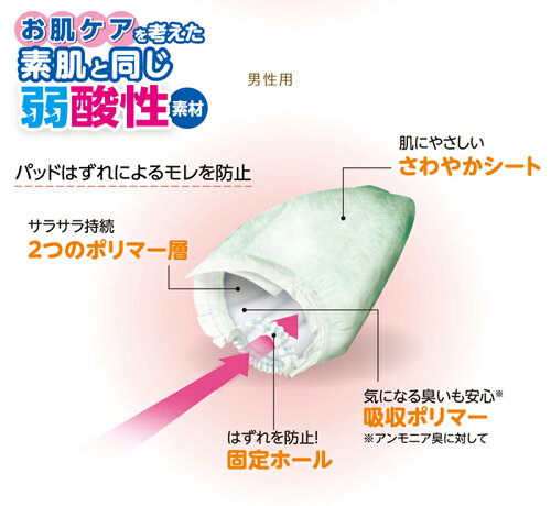 【商品情報】 ◇パッドタイプ男性用 ◇製品サイズ:22×40cm ◇個装入数:68枚入 ◇ケース入数:4袋入 ◇吸収量:おしっこ約1回分